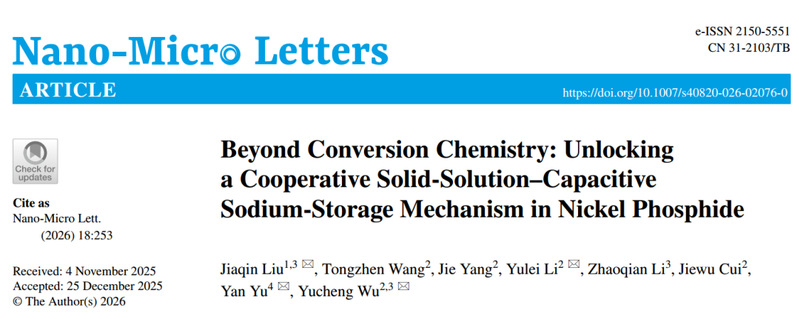 富镍相磷化镍(Ni2P)的理论容量高,电子导电性优异,是一种有前途的钠离子电池负极材料,但其电荷存储机制仍存在争议,经常被简化为转化反应。本研究设计了一种Ni2P复合电极,由嵌入磷掺杂类石墨烯多孔碳基体中的超小Ni2P纳米晶构成。研究发现了一种间隙固溶体机制:Na⁺经(111)取向的晶面通道占据晶格间隙位置,引发可逆的晶格呼吸效应,且不产生相变。嵌入过程与赝电容贡献协同耦合,形成一种协同存储机制。该电极可逆容量约560 mAh/g,10 A/下容量达135 mAh/g,循环2000次后容量仍保持263 mAh/g。将其与Na3V2(PO4)3@C正极组装成全电池,电池能量密度高达245 Wh/kg。