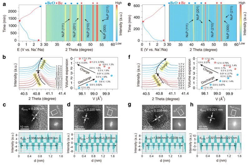图1.(a) Ni2P@GPC/CFP的合成示意图。(b) Ni2P@GPC/CFP、GPC/CFP和Ni2P的XRD图谱。(c、d) Ni2P@GPC/CFP的SEM图像,(e) 与之对应的EDX元素面扫描分布图。(f) Ni2P@GPC/CFP的TEM和(g) HRTEM图像。(h、i) Ni2P的FFT图。(j、k) Ni2P@GPC/CFP的P 2p和Ni 2p XPS谱图。(l) Ni2P@GPC/CFP和GPC/CFP的拉曼光谱。 采用煅烧-磷化法合成Ni2P@GPC/CFP复合材料(图1a)。在此过程中,乙酸镍部分还原为金属镍,催化碳前驱体发生石墨化转变,红磷既作为磷源,又作为反应调节剂调控碳骨架。同时,KOH活化产生了丰富的多级孔结构,最终得到与Ni2P纳米晶紧密结合的类石墨烯磷掺杂碳结构(图1a)。XRD图谱证实合成了结晶性Ni2P(图1b)。SEM图像显示(图1c、d),Ni2P@GPC均匀覆盖在碳纤维纸上(CFP),形成独立的三维导电结构。碳纤维纸还作为集流体和复合材料框架,代替了聚合物粘合剂、导电添加剂和金属箔,这种结构简化了电极制造过程,并通过减少非活性组分和提高电活性材料利用率从而提高了体积能量密度。能谱分析元素分布图表明,Ni和P元素均匀分布在类石墨烯碳基体中(图1e)。TEM表征(图1f)进一步揭示了超薄类石墨烯多孔碳结构,该结构不仅提供了快速的电子/离子传输通道,还缓解了循环过程中Ni2P的体积膨胀。高分辨透射电子显微镜图像及选区电子衍射呈现出清晰的晶格条纹(图1g-i),对应于Ni2P的(111)和(201)晶面,与XRD结果一致,证实Ni2P具有高结晶性。 P 2p谱图中130.5和129.7 eV的峰归属于P-Ni,形成了Ni2P;133.8 eV处的峰归属于P-C,说明GPC中掺杂了P(图1j)。Ni 2p谱图中856.9 eV和874.7 eV为Ni²⁺的特征峰,并伴随存在卫星峰(图1k),这表明材料表面发生氧化反应并存在界面Ni-P-C相互作用,这有助于界面电荷转移。拉曼光谱显示,Ni2P@GPC/CFP与GPC/CFP在1354 cm⁻¹和1590 cm⁻¹处均出现明显的D带和G带,且ID/IG比值几乎相同,说明两种材料的缺陷密度相近,且P掺杂提升了表面反应活性(图1l)。 测试结果分析 图2. Ni2P@GPC/CFP在Na+嵌入/脱出过程中的结构演变。(a) 首次循环过程中的充放电曲线及原位XRD图谱。(b) 首次循环过程中Ni2P (111)晶面的XRD衍射峰演变及相应的晶胞体积变化。首次循环中Ni2P在放电至0.01 V (c)和充电至3.0 V (d)下的HRTEM图像及对应的FFT图。(e) 第10次循环过程中的充放电曲线及原位XRD图谱。(f) 第10次循环过程中Ni2P (111)晶面的演变及相应的体积变化。第10次循环中Ni2P在放电至0.01 V(g)和充电至3.0 V(h)的HRTEM图像及对应的FFT图。 通过原位/非原位表征及DFT计算,进一步阐明Na+的存储机制。通过第1次及第10次循环过程中的原位XRD测试发现(图2a,e),Ni2P@GPC/CFP在Na+嵌入/脱出过程中始终保持晶体结构,未出现新的衍射峰,排除了基于转化反应的过程。Ni2P(111)晶面衍射峰在Na+嵌入过程中向低角度发生完全可逆的位移,并在Na+脱出后恢复至初始位置,对应约2.5%-2.7%的可逆晶胞膨胀(图2b,f),表明存在晶格呼吸行为。Ni2P(111)晶面的晶面间距(0.220 nm)远大于去溶剂化Na⁺的尺寸(~0.102 nm),而其他低指数晶面的间距则远小于该值。因此,Na⁺的嵌入在几何构型上优先沿(111)取向的晶面通道进行,使Na⁺能够选择性占据Ni2P晶格中的间隙位点。非原位HRTEM进一步证实这一行为:首次循环中,放电至0.01 V时,(111)晶面间距从约0.220 nm膨胀至约0.226 nm,随后充电至3.0 V时又收缩回约0.220 nm(图2c,d)。在第10次循环中观察到相似的变化趋势(0.228 nm→0.221 nm;图2g,h)。这种在多圈循环中持续存在的可逆晶格呼吸行为,证实Ni2P经历了低应变、非转化型间隙固溶体机制。