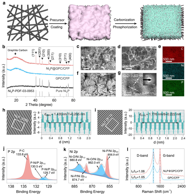 目前,Na+在Ni₂P负极材料中的储存机制仍存在争议,传统的Na+储存模型主要归因于转化反应,最终形成Na3P和金属Ni。然而,近期的原位表征研究未能检测到这些预期晶体产物,传统的转化反应机制与实验结果存在明显的矛盾。当材料尺寸减小到临界值(~20 nm)以下时,热力学和动力学发生改变,会抑制传统的转化反应,转而出现间隙固溶体过程并伴随表面赝电容贡献。这种嵌入-电容协同机制在一些过渡金属硫属化合物中已被证实,但在过渡金属磷化物中是否也存在,因缺乏直接的原位结构证据而尚不清楚。本工作通过构建一个分层的,独立的Ni2P@GPC/CFP复合电极,将超小的Ni2P纳米晶体整合到碳纤维纸(CFP)基底上的石墨烯类磷掺杂碳(GPC)基质中,从而解决了Ni₂P中长期存在的Na⁺存储机理争议。